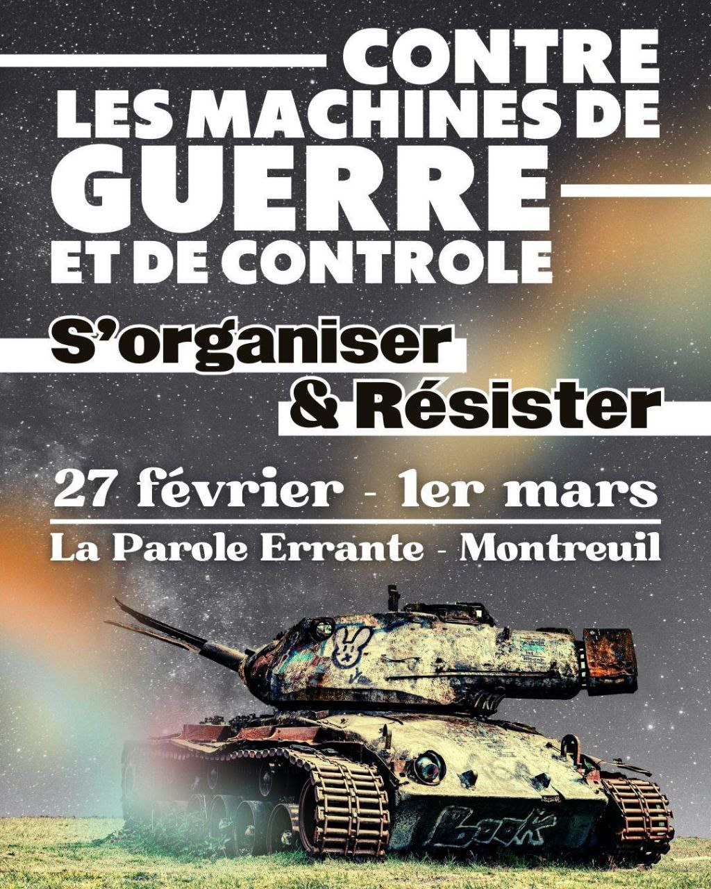 La coalition Guerre à la guerre invite tous·tes celle·ux qui refusent la marche vers la guerre à nous rejoindre pour continuer de construire le mouvement, et nous organiser ensemble lors d’un grand weekend de discussions et de mobilisation du 27 février au 1er mars à la Parole Errante à Montreuil.
