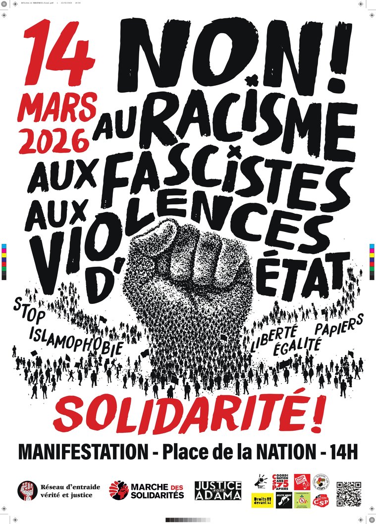Samedi 14 mars, ponctuant une semaine de mobilisations nationales (grève féministe et manifestations du 8 mars, luttes dans l’éducation, Semaine Noire du 8 au 14 mars, campagne contre l’islamophobie du 7 au 15 mars…) et veille du premier tour des élections municipales, nous appelons à manifester massivement sur tout le territoire contre le racisme, le fascisme, les violences policières, les crimes d’État, pour l’égalité des droits et la solidarité.
