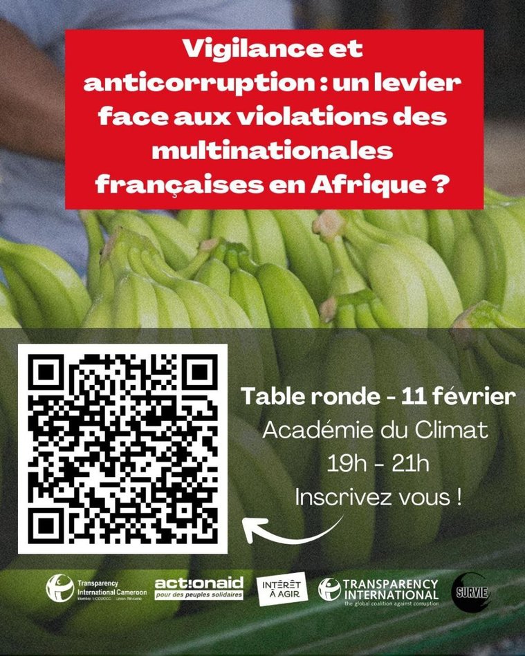 Le 9 décembre 2025, Transparency International Cameroon, Transparency International et ActionAid France, avec le soutien du collectif Intérêt à Agir, ont adressé une mise en demeure à la Compagnie Fruitière. La multinationale française est mise en cause pour le non-respect de ses obligations au titre de la loi sur le devoir de vigilance, en lien avec les activités de sa filiale camerounaise, les Plantations du Haut-Penja (PHP). La table ronde permettra de présenter l’action, en la replaçant dans le contexte plus large des intérêts économiques des multinationales françaises en Afrique (en lien avec le dernier rapport de Survie), et d’interroger les articulations entre devoir de vigilance et anticorruption.